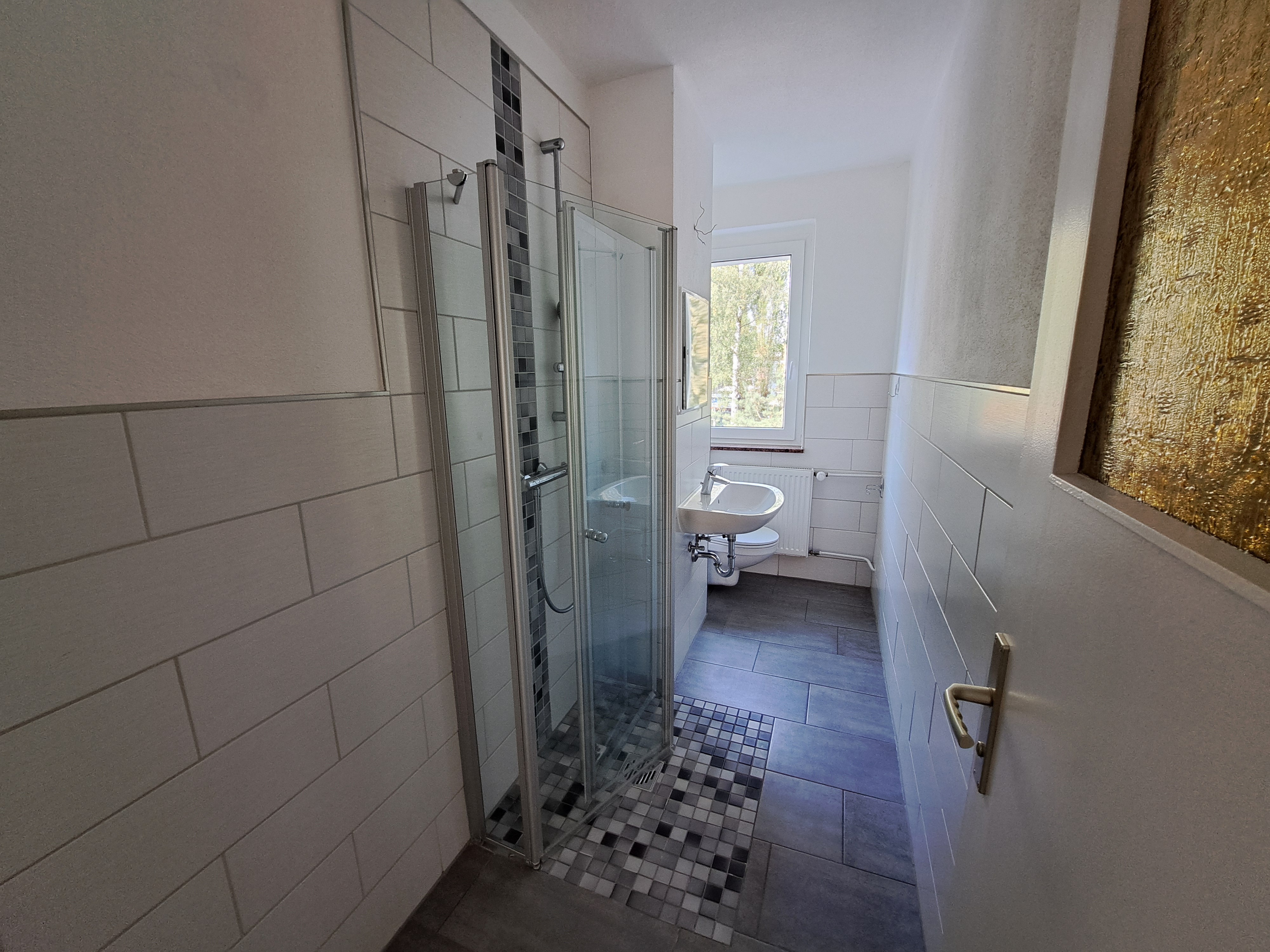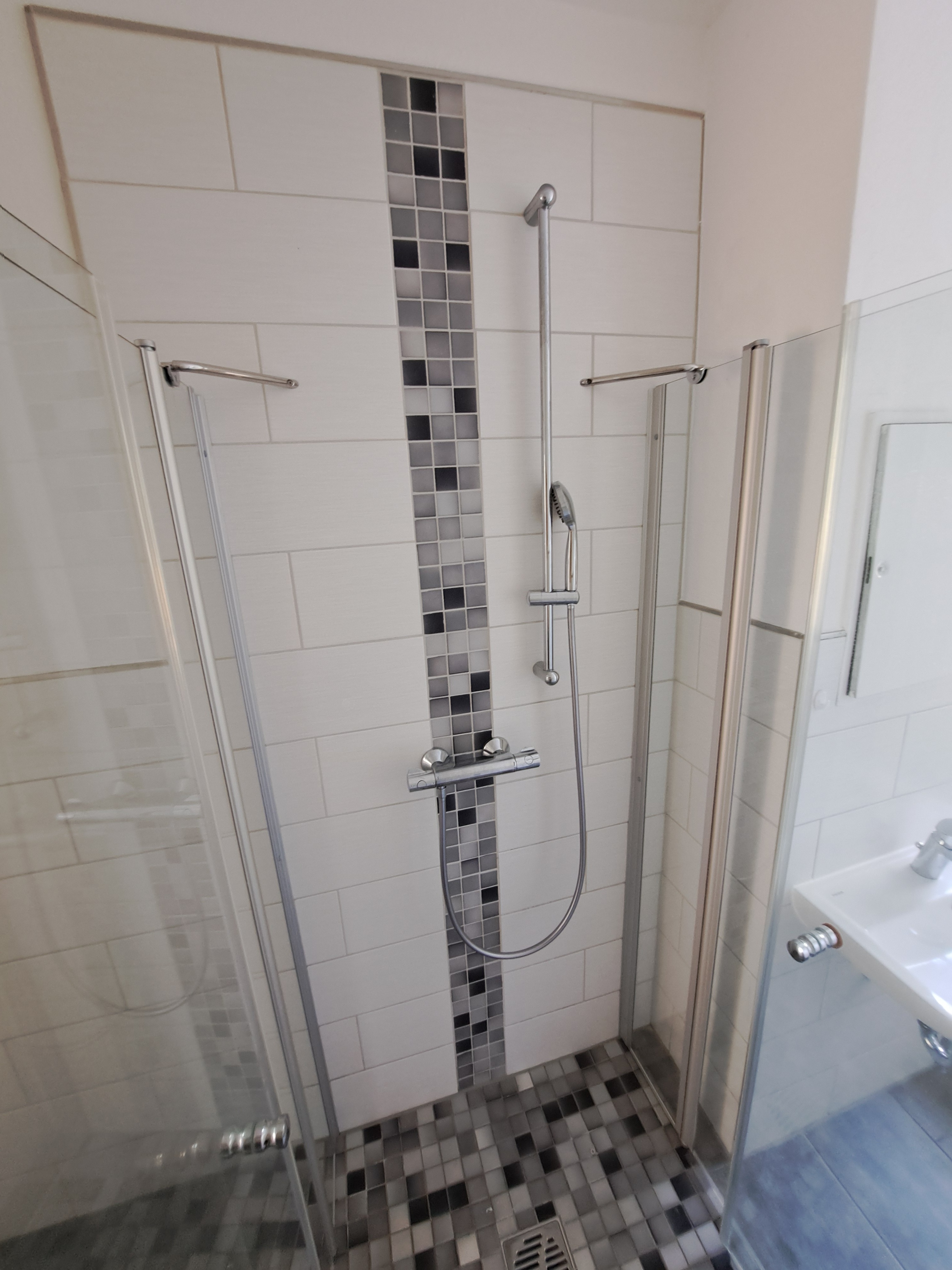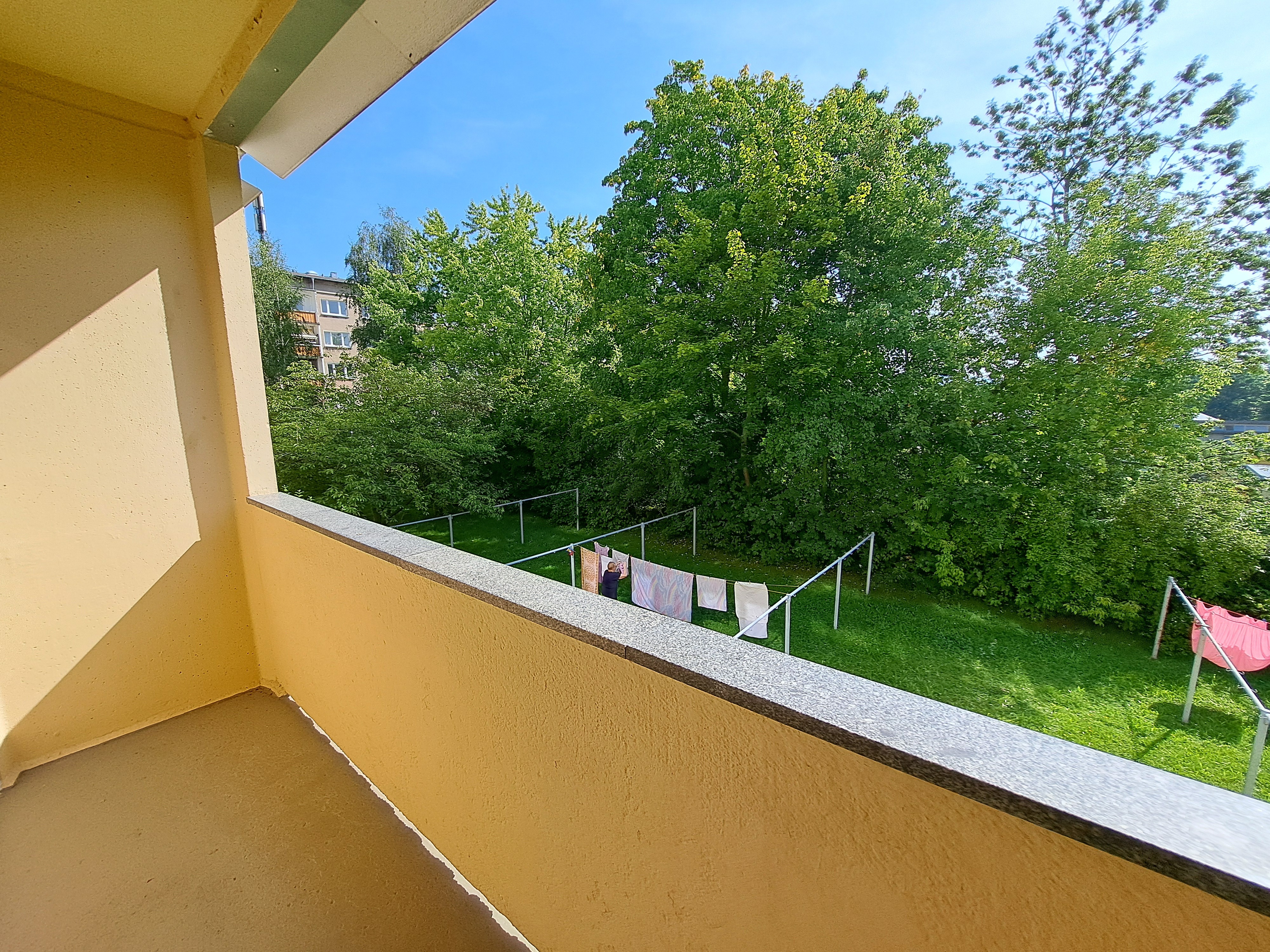 Das Tageslichtbad wurde in den vergangenen Jahren umfangreich modernisiert und eine neue Dusche wurde eingebaut. Das Kinderzimmer, die Küche als auch das Bad befinden sich in Richtung der Straße, durch einen bewaldeten Grünstreifen ist dies jedoch optisch getrennt. Der Schlaf- und Wohnbereich als auch der Balkon befindet sich auf der Hofseite. Man schaut direkt ins Grüne und kann die Ruhe genießen.